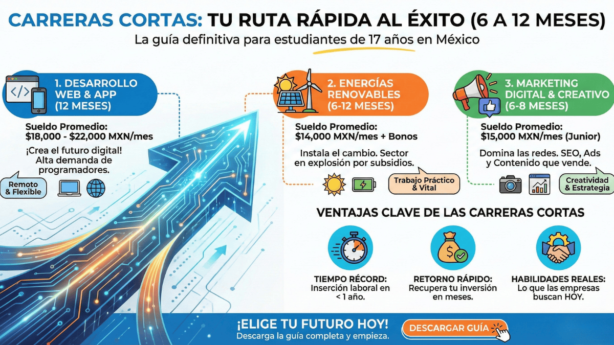 Si buscas independencia financiera sin pasar media década en el aula, las carreras cortas de 6 meses a 1 año son tu mejor jugada. La realidad en México ha cambiado: hoy las empresas valoran más las habilidades técnicas certificadas que los títulos largos, permitiéndote entrar al mercado laboral con sueldos competitivos desde los 17 años. Por ejemplo, mientras un pasante de derecho gana apenas para sus gastos, un desarrollador web egresado de un programa de 12 meses inicia con $18,500 MXN promedio, y un técnico en energías renovables (formación de 8 meses) percibe unos $14,200 MXN mensuales instalando el futuro energético del país.