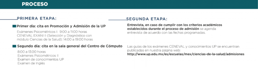Esta convocatoria abarca solamente 3 carreras: medicina, enfermería y psicología que conforman la Escuelas de Ciencias de la Salud de la UP. Los pasos de esta convocatoria, así como las fechas en que se desarrollan son las mismas para las tres carreras. Si te aceptan en este proceso de admisión ingresarás a la universidad en Agosto.