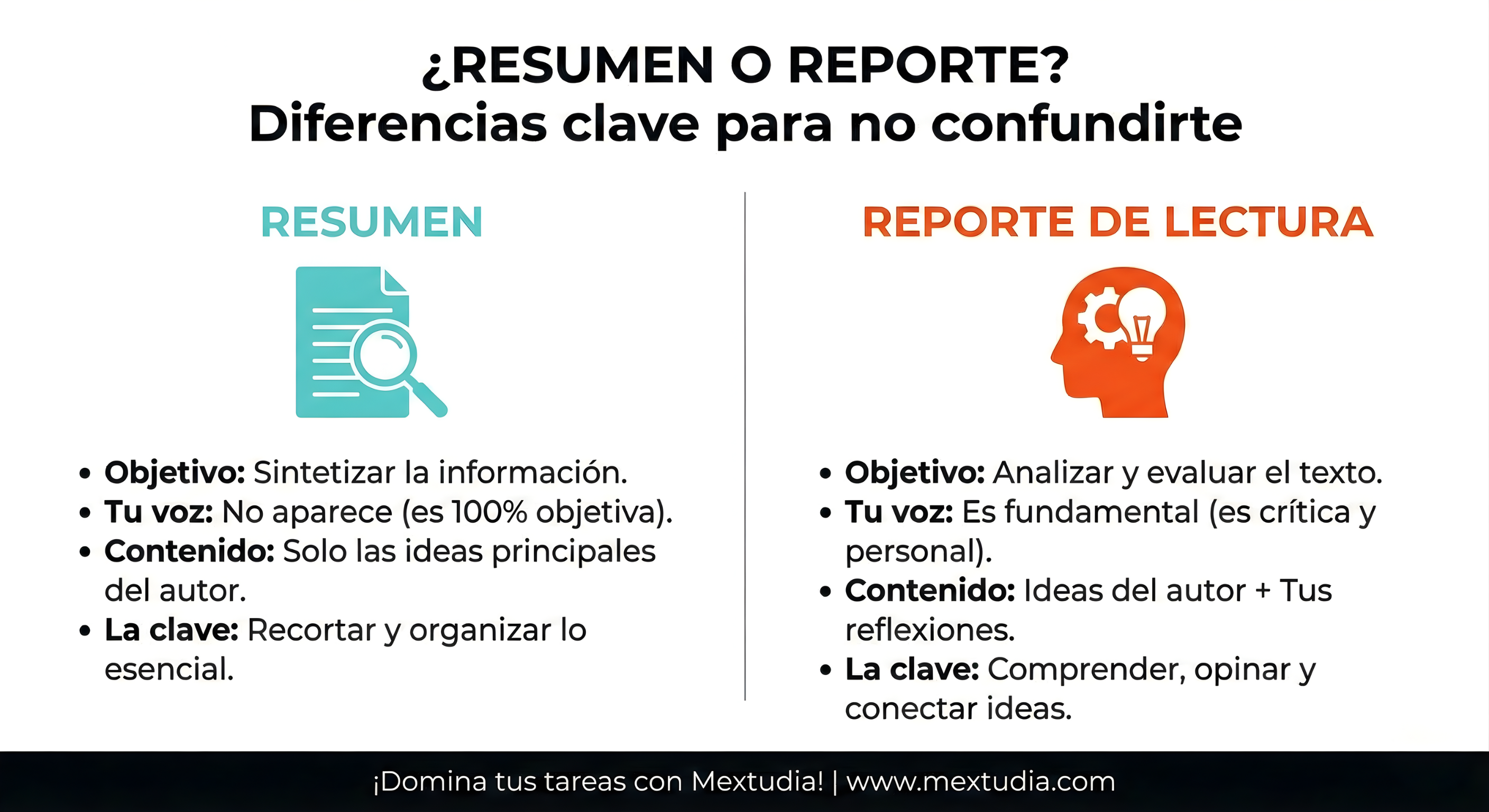 Un resumen se limita a recortar y pegar las ideas principales del autor. En cambio, un reporte de lectura es un texto donde demuestras que no solo leíste, sino que entendiste, analizaste y tienes una opinión sobre el texto.